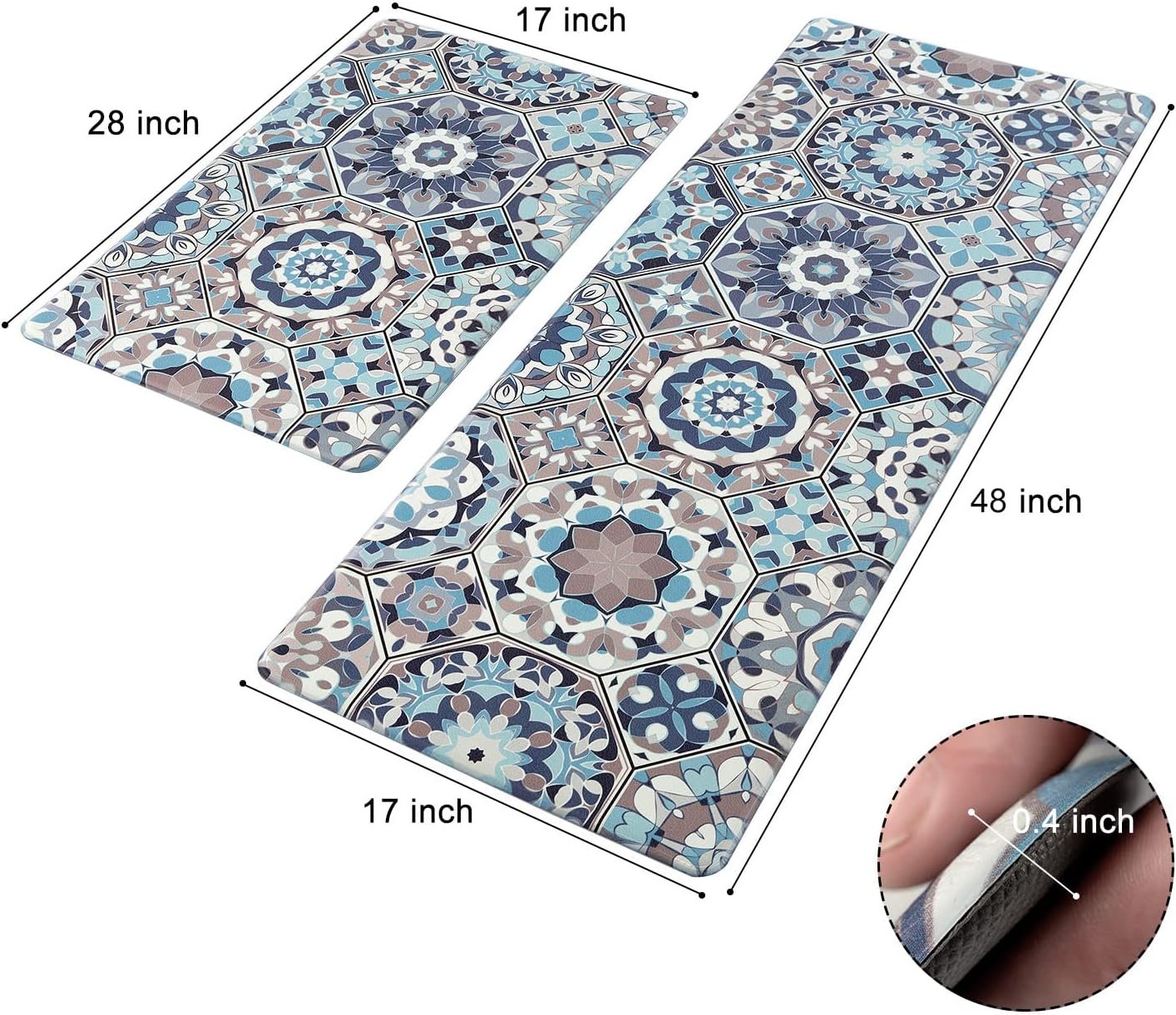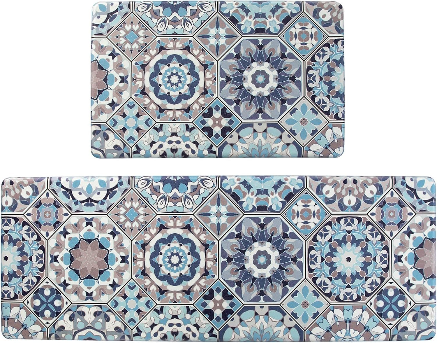 Jabogrii Anti Fatigue Kitchen Rugs and Runners Set of 2 Blue Cushioned Kitchen Rugs Comfort Floor Mat PVC Waterproof Non Slip Kitchen Carpet Rug Runner for Sink Laundry…